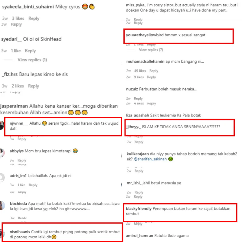 Netizens commented on the “Hantu Raya Pergi Perang” star’s original buzz cut post as well as on her more recent ones of just her going about her day. Many called her out for sporting a look that’s considered ‘haram’ in Islam and even questioned her religion while others made jokes about her having cancer. There are also those who called her ugly for having a shaved head.