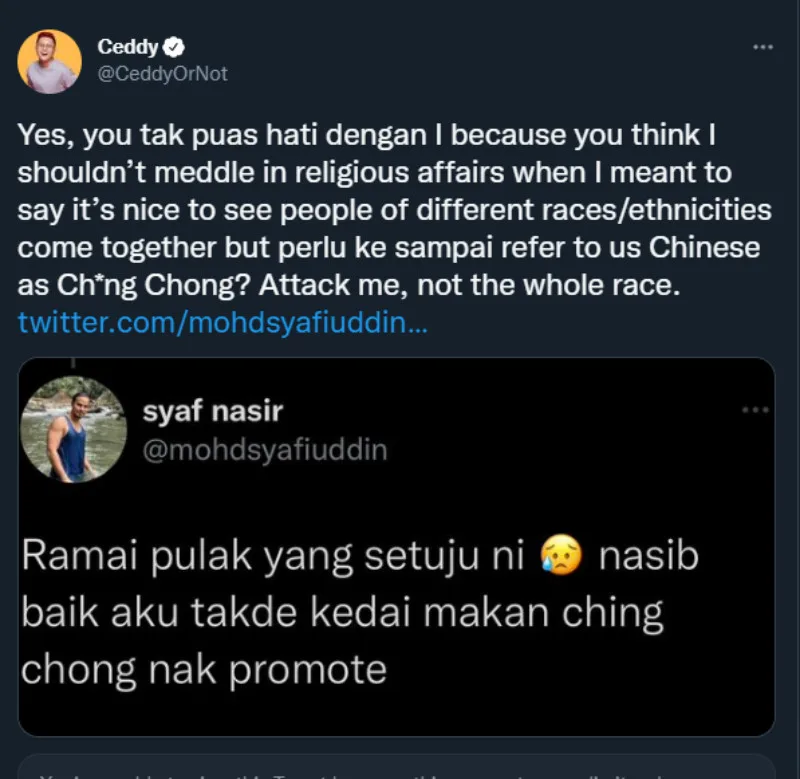 The blogger deleted the tweet but still defended his statement by calling out the netizen that started the fire. “Yes, you’re not satisfied with me because you think I shouldn’t meddle in religious affairs when I meant to say it’s nice to see people of different races/ethnicities come together but did you have to refer to us Chinese as Ch*ng Chong? Attack me, not the whole race,” he said.