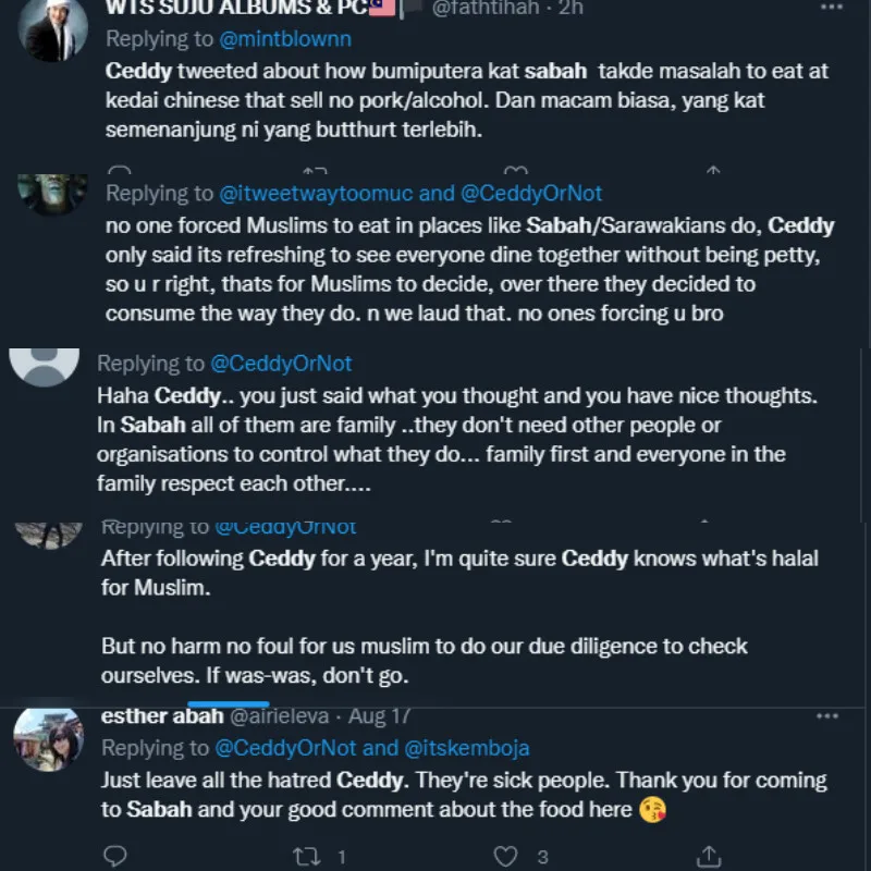 Earlier today (Thursday, 18th August), the influencer deleted a tweet of him praising the fact how the Malays in Sabah have no problem dining at Chinese restaurants that don’t serve pork or alcohol, saying that it’s refreshing to see everyone, regardless or race/religion, dining together with little to no issue. While the intention for the tweet was good, one netizen in particular disagreed with his statement.