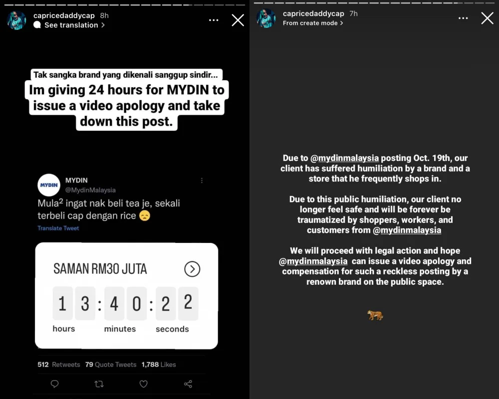 The tweet blew up and caught the attention of Caprice. Several hours later, to everyone’s surprise, the celeb posted on his Instagram Stories, demanding an apology video from Mydin. In addition to that, the influencer had also given Mydin 24 hours to do so or he would sue a whopping RM30 Million.