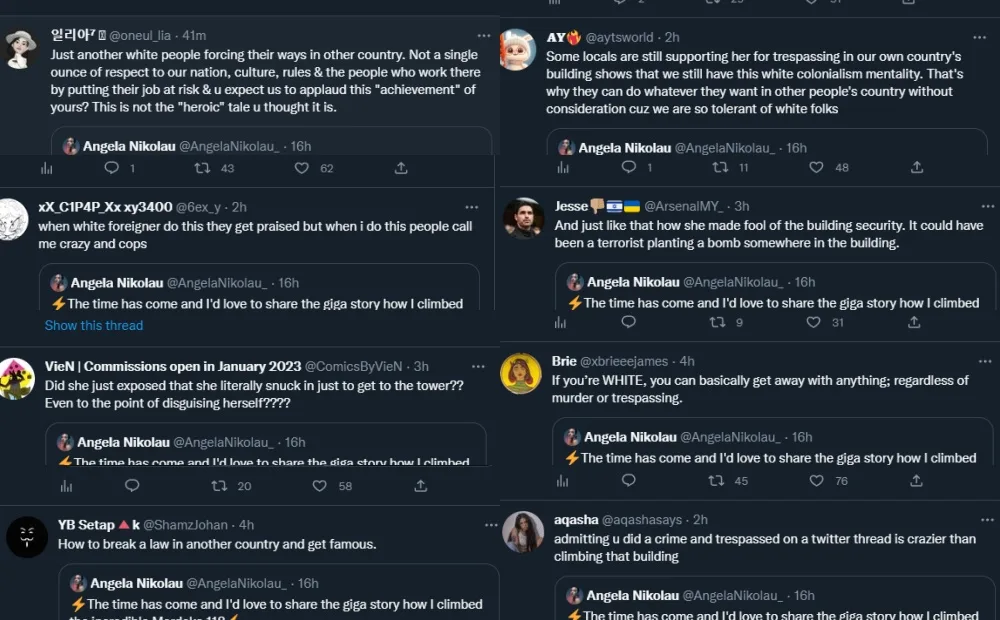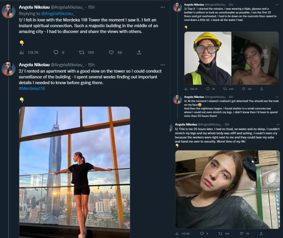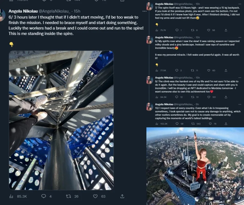 Extreme content creator Angela Nikolau posted on her Twitter to tell the story in full detail of how she climbed up the iconic Merdeka 118 tower alone. “I fell in love with the Merdeka 118 Tower the moment I saw it. I felt an instant spiritual connection. Such a majestic building in the middle of an amazing city – I had to discover and share the views with others,” she tweeted.