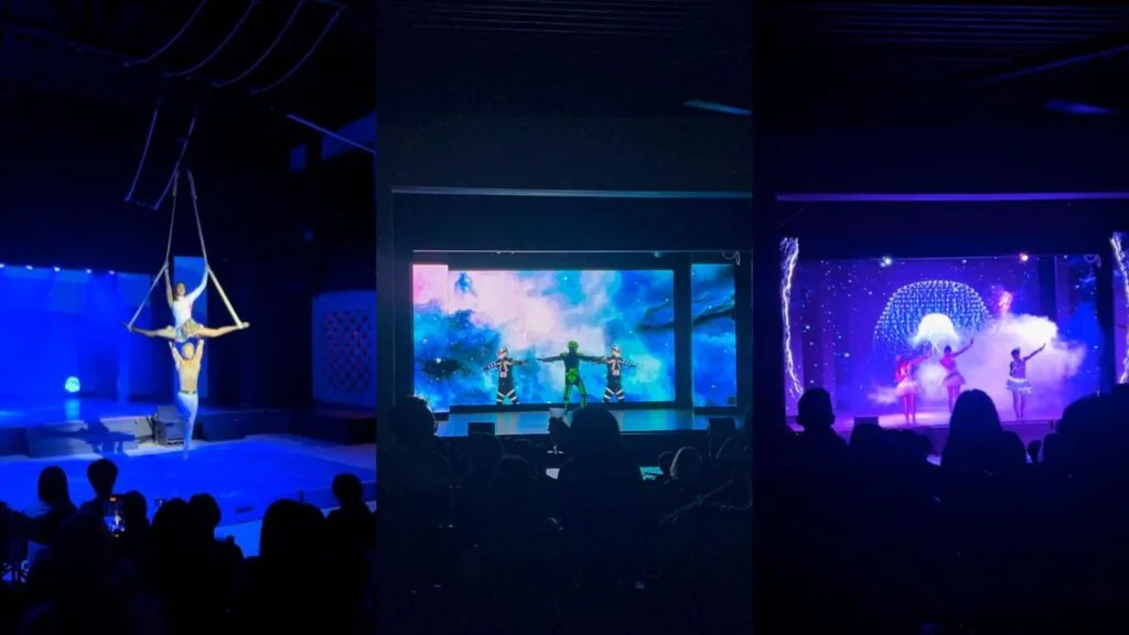Now comes the fun part. In our schedule, we were told that our outfits needed to follow the theme of the day (not compulsory, but encouraged). Little did we know that at Club Med Cherating, there’s a theme every day. So, on our first day, the theme was cappuccino. All of us were dressed in shades of white and brown. At 9pm, we were ushered to a theater show. Here’s the surprising part: none of the performers were outsiders, as they were all the GOs themselves! Today’s show was more a mix of digital dance, ballet and trapeze artistry. It was simply amazing how they all worked together to put on an amazing show for us. The sound, lighting and screen were all super amazing.