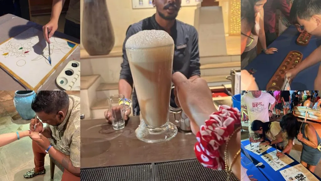 After dinner, we headed to the main lobby for yet another party night. Tonight’s theme was Asian. For the 9pm theater show, we had a lion dance. Then, we had a walk down memory lane with all sorts of traditional games and activities prepared for us. There was batu seremban, batik painting, guli, Chinese caligraphy, pemadam, mahjong, card games, massage station, henna and many more. It was so nice to see guests of different races and cultures getting to know Malaysian traditions and games. Our favourite part was the teh tarik station, where we had a good dose of freshly brewed teh tarik.