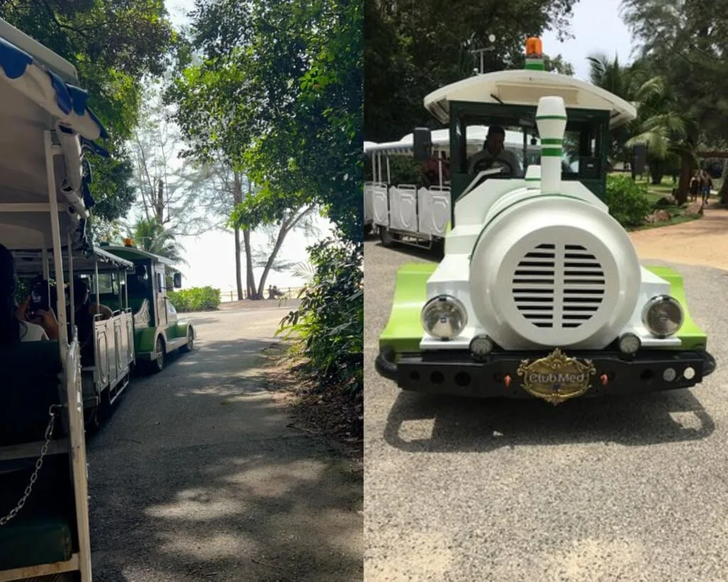 The mode of transportation from the main resort to the other side is the tram. It’s like one of the trams you see at Zoo Negara. The tram is scheduled every 30 minutes throughout the day. Just jump on the tram and go for a quick ride through the lush green forest. The pick-up point is Enak Restaurant (just by the main pool) and the private beach. It was indeed a fun ride.