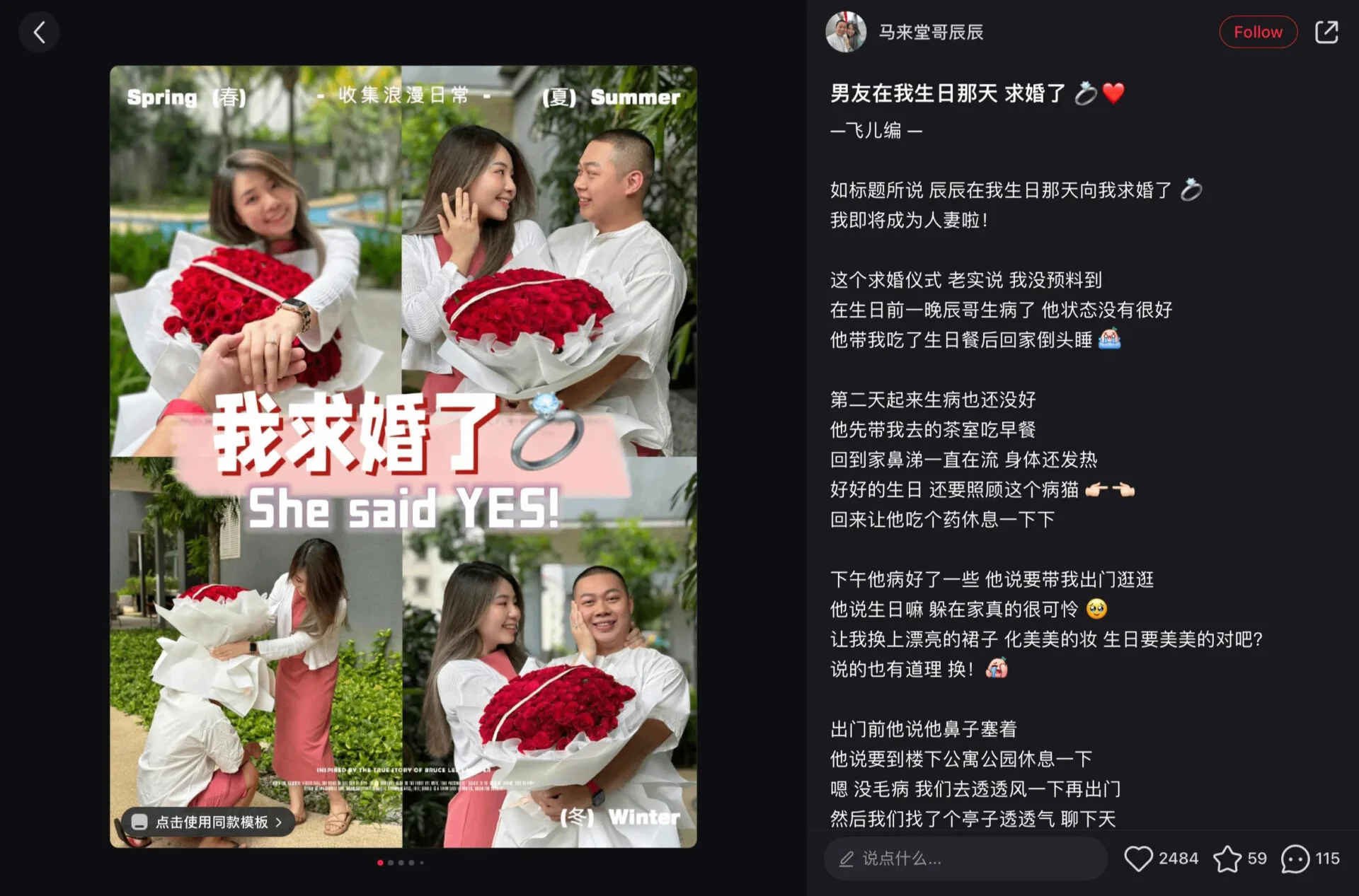 In her post, she mentioned that the method of proposal was unexpected. She added that Chen Chen fell sick on the night before her birthday, so his condition was not the best. “After he brought me out for my birthday dinner, he just slept off when we reached home.”