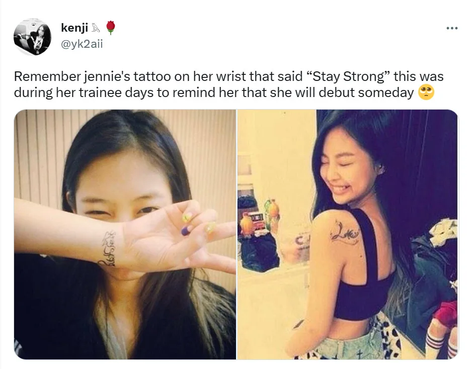 Jennie was previously spotted with a large tattoo on her wrist prior to making her official K-pop debut with BLACKPINK. She sported a temporary tattoo on her wrist with the words “Stay Strong” designed in cursive, which presumably served as a self-encouragement message especially during her tough trainee days. After she debuted, the tattoo was no longer visible.
