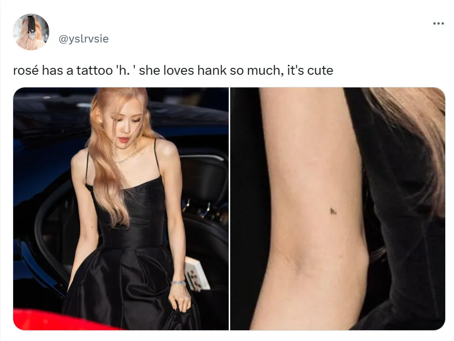 Last week, Rosé’ walked the red carpet at the Sulwhasoo and the Metropolitan Museum of Art party in New York city. The Australian idol immediately caught the attention of fans with her demure look. At the same time, eagle-eyes fans took notice of a small tattoo on her arm. It is known that the small “h” ink is an abbreviation for the name of her pet dog, Hank, symbolising Rosé’s undying love towards her furry companion.