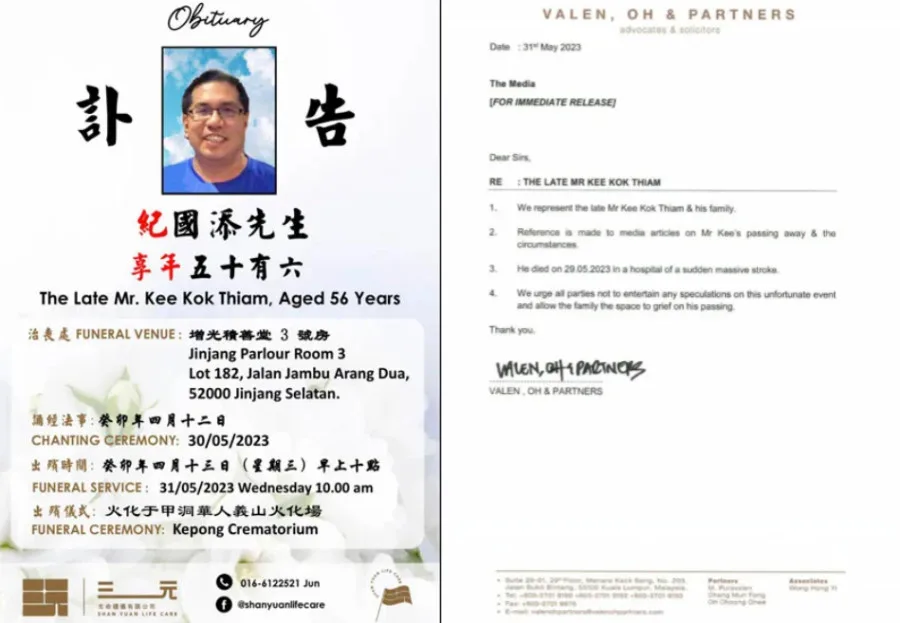 A wake for Kee Kok Thiam was reportedly held on Tuesday (30th May), while his funeral will be held today (31st May). He will be cremated at the Kepong Crematorium later today. The Star added that alleged family members present at the wake yesterday had claimed they “knew nothing” when approached.