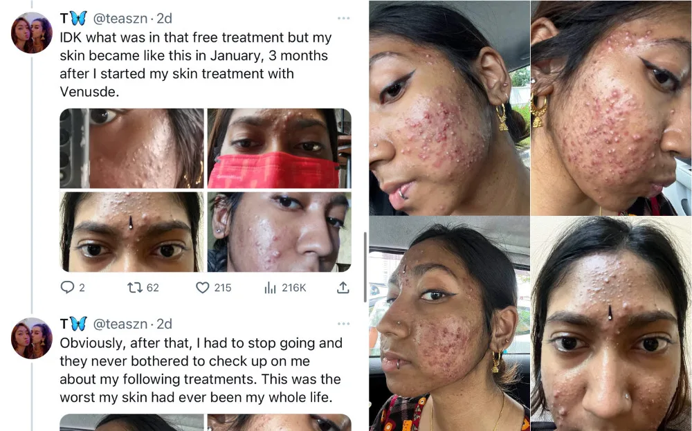 A Twitter user known as T recently shared a thread about how her skin went from clear to damaged after attending facial treatment sessions at Venusde Beauty Salon last year. She said that she was first interested in their Pico Laser treatment due to its reasonable price of RM99 – but after attending the first session, she immediately realised the salon’s shady practices.