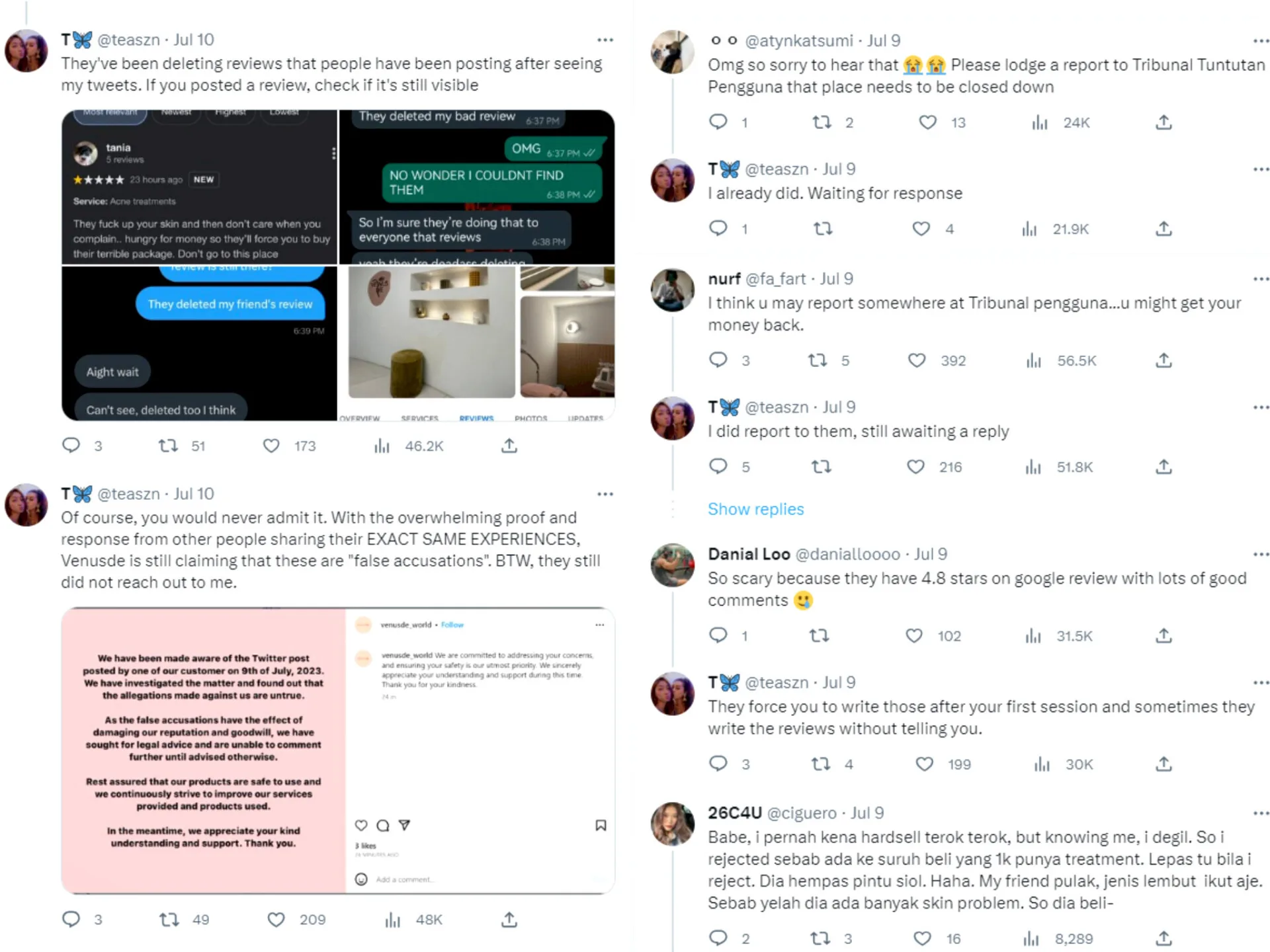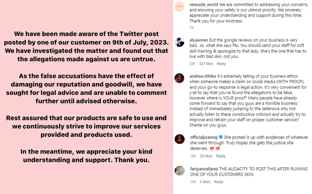 After the Twitter thread went viral, Venusde uploaded a post on their social media to deny the allegations, adding that they would take legal action against T. This response was not well-received by netizens, who called the clinic out for its unprofessionalism. Many also commented that the clinic odd to take responsibility and apologise to T and other customers negatively affected by their services.