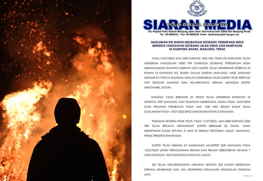 Police were dispatched after receiving a distress call from the victim’s younger brother around 6:42pm. The 33-year-old victim was immediately rushed to Seri Manjung Hospital to receive treatment. However, the victim was confirmed to have passed away at 12:20pm yesterday (Wednesday, 12th July). Through investigation, it was found that the suspect was furious over the accusation of drug abuse that he decided to burn his wife alive.