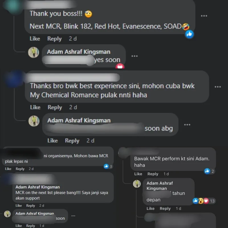 Some requested for many legendary rock bands to come to our shores such as Evanescence, Blink 182, Foo Fighters, and Artic Monkeys but the most requested band in the comments section was My Chemical Romance (MCR). That dream may come true as Adam hinted that he and his team will make it happen by replying, “Soon” to some of the comments.