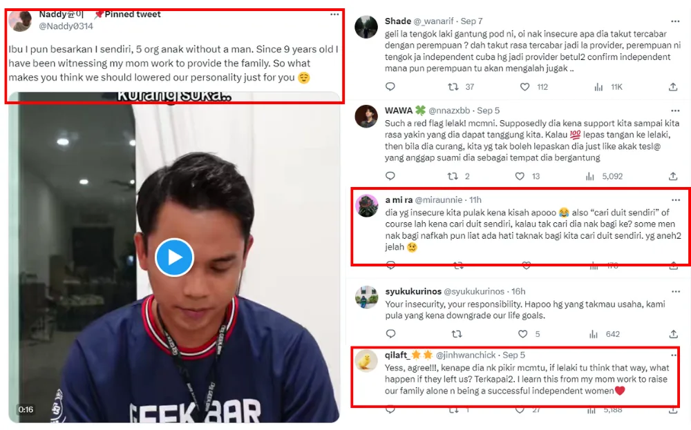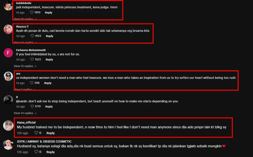 Unsurprisingly, Aiman’s statement made many women angry and said they would never change themselves to please insecure men. Another comment pointed out that despite Aiman claiming that men find independence unlikable, dependent women will also get judged and called out for wanting the “princess treatment”. Many women also shared that they were taught to be independent by the men in their lives, debunking Aiman’s claim that independence is unlikable.