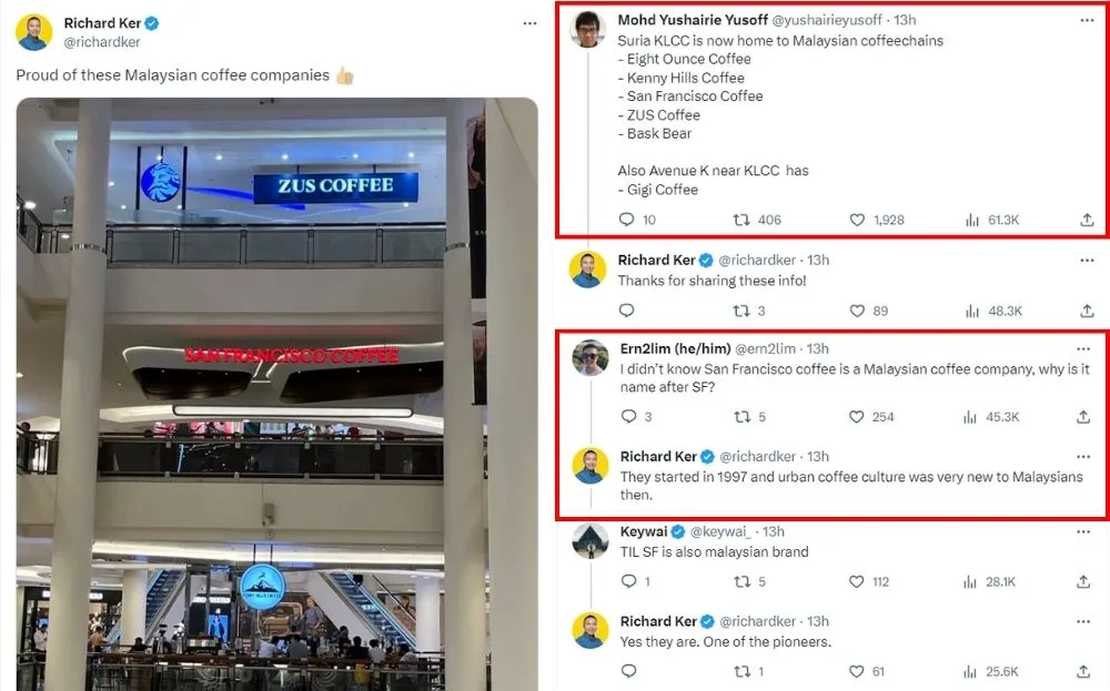 The tweets quickly gained traction amongst Malaysians, who were pleasantly surprised to discover that the coffee chains were local brands. Many said it was new knowledge to them that San Francisco Coffee was a local brand, given the name. According to its history, the coffee chain started operations in 1997 at Desa Serdang. While the reason for the name “San Francisco” was not specified, it’s believed that the founders drew inspiration from the city itself, which had a big coffee culture.