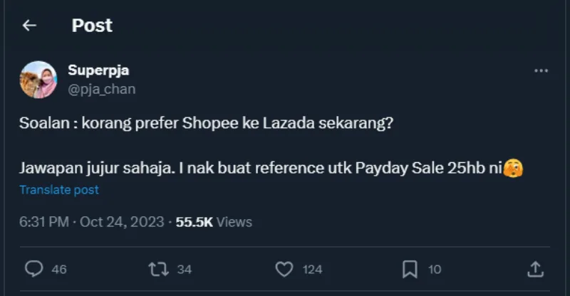 Yesterday (Tuesday, 24th October), a netizen who goes by the username @pja_chanposted a question on Twitter asking netizens which online store app they prefer using and why; Shopee or Lazada? “You can answer honestly, I’d like to keep a reference for the PayDay Sale on the 25th of this month,” she tweeted. The tweet reached tons of netizens with many giving their opinions on which one has benefited them the most.
