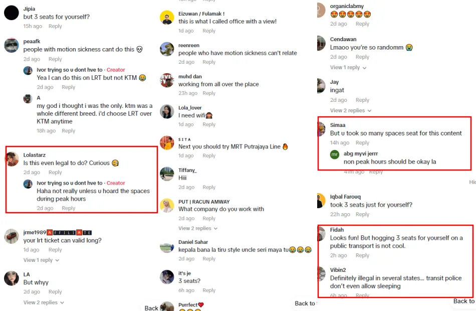 The TikTok post went viral with netizens being both impressed and concerned. Some applauded her for her dedication on creating this content while others wondered if it was even legal for her to do this on public transportation. A few criticised Ivor for hogging 3 seats on the train with her bag and portable table.