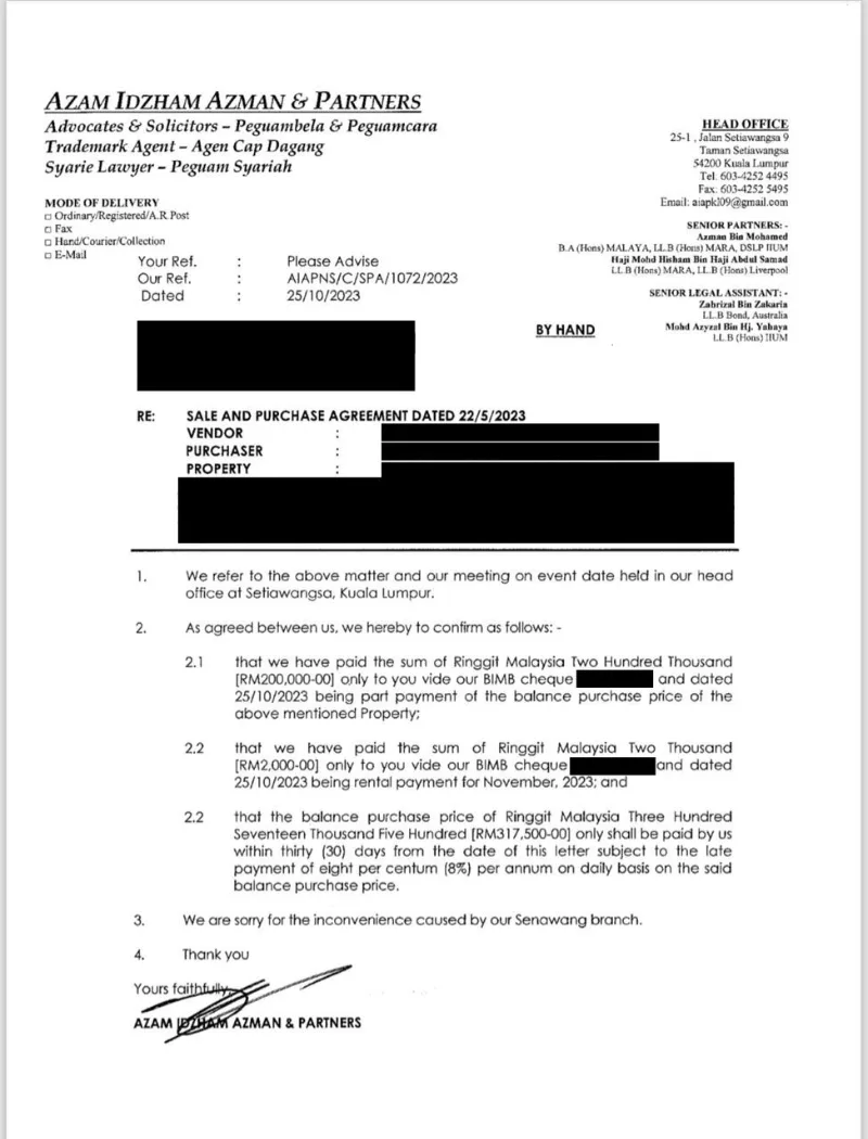 In his post, Timothy explained that his family decided to sell their house for RM500,000 in May 2023. After finding a buyer, they proceeded with the sales and purchase agreement, handled by the buyer’s chosen law firm, Azam Idzham Azman & Partners, and the lawyer, Yusyairi Ahmad. The process initially went smoothly, with the buyer making a full payment via a cheque to the law firm in June 2023.