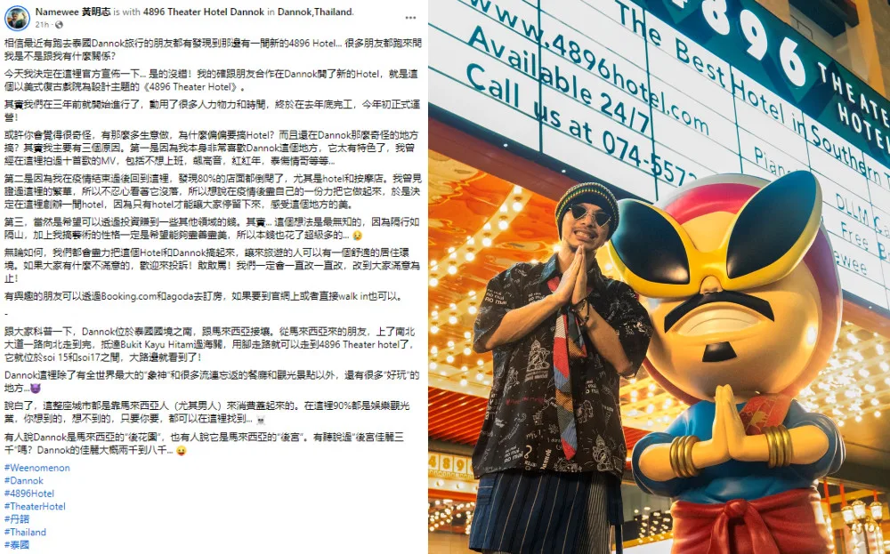 Namewee added that the hotel is at the perfect location for Malaysians, as it’s near the Thai-Malaysia border. “You can walk to the 4896 Theater Hotel by foot, it is located between soi 15 and soi 17, and you can see it on the roadside!” he shared. He also mentioned several attractions, including the world’s largest “elephant god”, unforgettable restaurants and “fun” places.