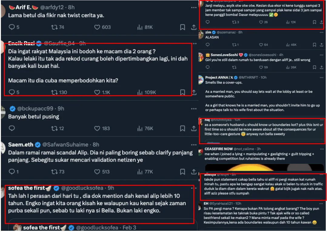 Netizens, however, were not buying their stories. After the statements were reposted, many said that the two stars should’ve known better. Some blamed Ruhainies for inviting a friend’s husband behind her back while others blamed Aliff for not knowing boundaries, especially after what happened last time. Others pointed out how neither of them mentioned anything about Bella Astillah being aware of the dinner invite. A few accused them of lying about the whole thing.