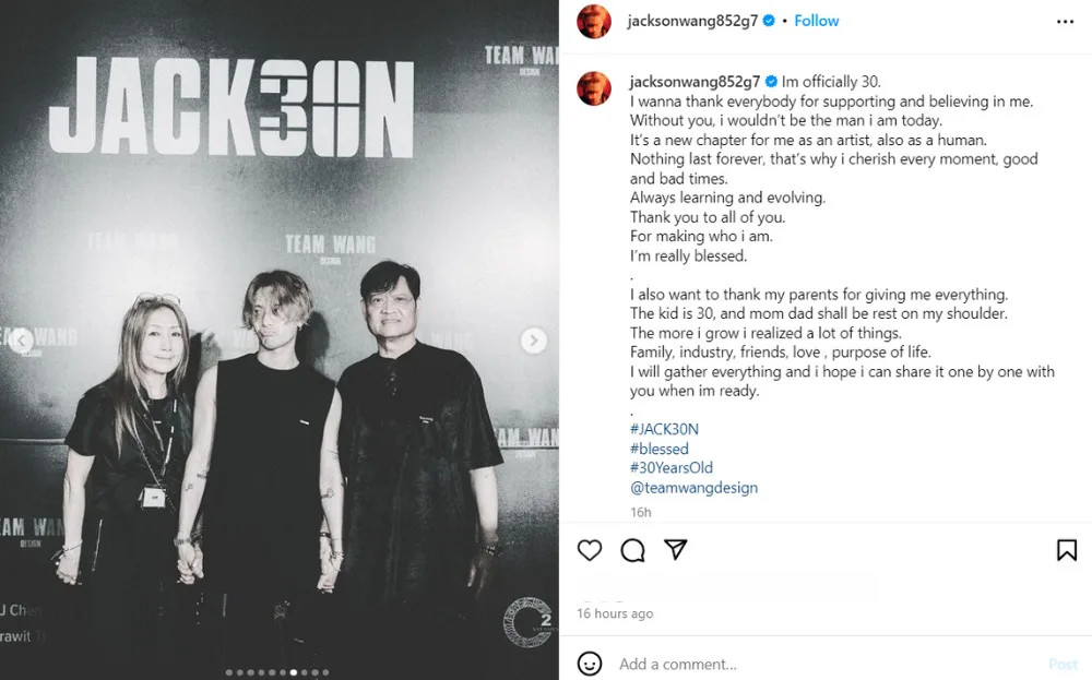 Meanwhile, Jackson also took to Instagram to share his gratitude for his loved ones and supporters after turning 30 on 27th March. The GOT7 member also shared photos from his birthday party, as well as a photo taken with his parents. In his captions, Jackson also wrote a touching message for his parents, thanking them for giving him everything. His agency Team Wang shared more photos of the lavish party, which also had a giant Jackson statue and a fireworks show.