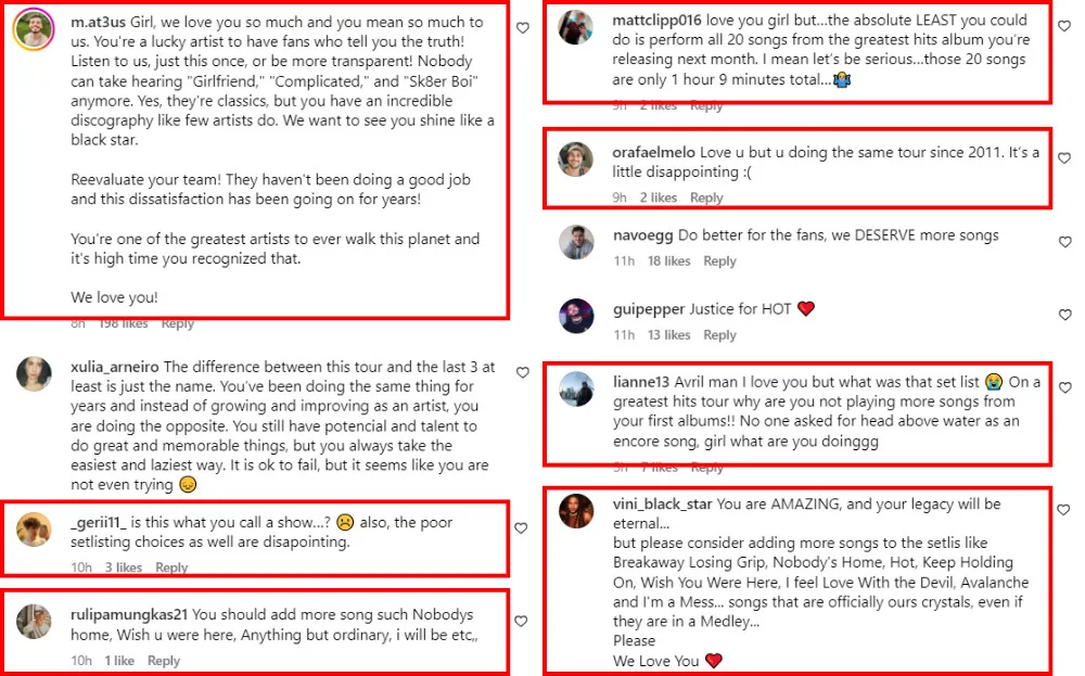 According to comments, Avril has been performing a similar setlist for years, which includes her most popular songs and a handful of B-side tracks. When comparing the setlist from this tour with the one from her previous “Love Sux Tour”, only four songs were different. Many fans have taken to social media, commenting on Avril’s posts to show their disappointment over the lacklustre setlist.