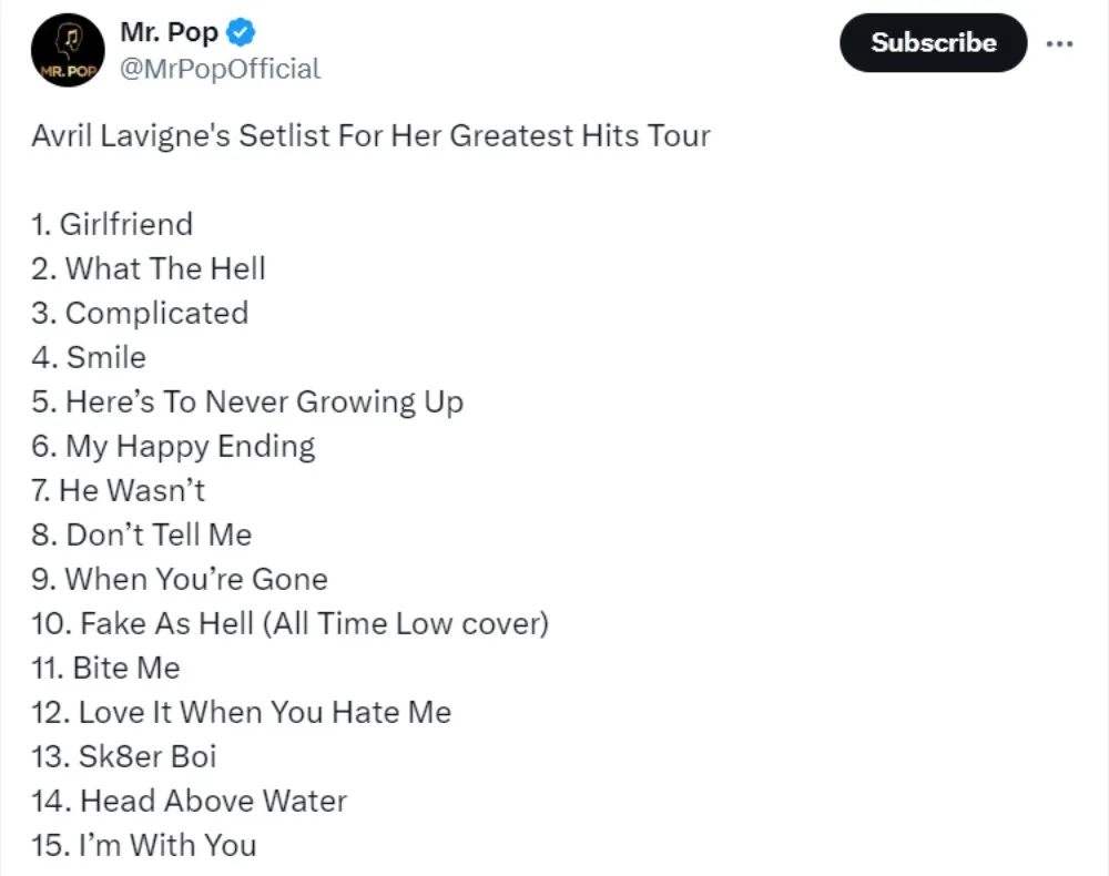 In Avril’s case, it seems that a 15-song setlist is a norm for the singer, as all of her previous tours since “The Avril Lavigne Tour” only contain a maximum of 15 songs on their setlists. However, the length is just half the issue because fans are also disappointed about the lack of variety.