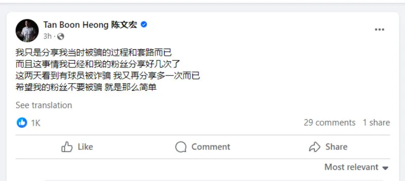 During a (now-deleted) Facebook livestream, former world men’s double No. 1 Tan Boon Heong (陈文宏) said that he resonated with Pei Jing’s story and recalled the time he lost RM2.5 million to a scam back in 2017. However, it was reported that some fans were sceptical about the authenticity of his story.