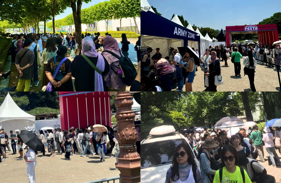 Around 100 reporters were at the scene and managed to capture the very lively atmosphere of ARMYs patiently waiting in the hot sun to celebrate the momentous occasion with their idol. A few even interviewed some of the enthusiastic fans waiting in line. Apart from the extremely long queue, fans began sharing photos and videos of everything the event space has to offer from attractions to games to limited-edition merch.