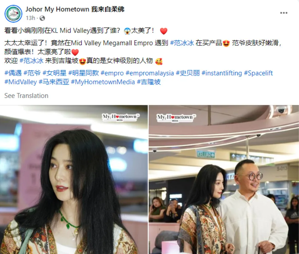 According to a post from the Facebook page “Johor My Hometown 我来自柔佛”, Fan Bingbing paid a short visit to the Mid Valley Megamall in Kuala Lumpur on 13th June (Thursday). It seems the actress stopped by the Empro store to check out some beauty products from the brand. While it’s not sure whether it was part of an official visit or just a casual drop, Empro founder Prof Dr Coco Lee was also present during her visit.