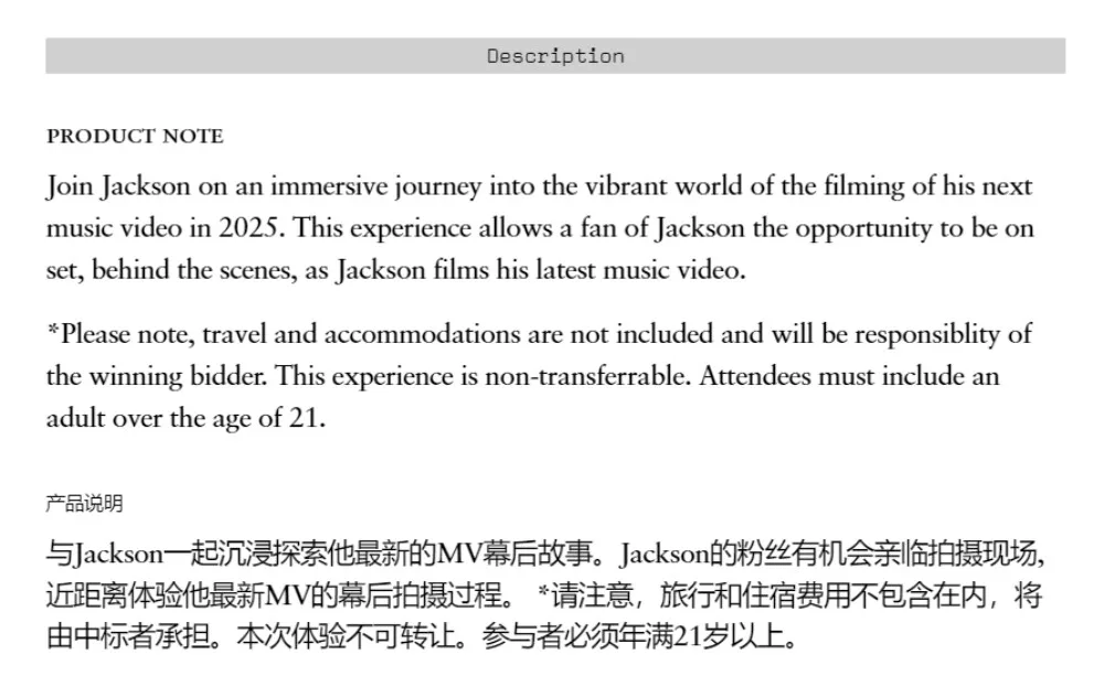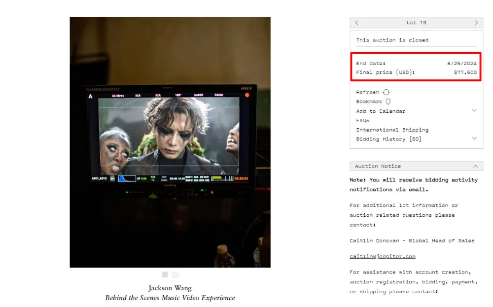 However, the most coveted “item” in the auction was the opportunity to experience a Jackson Wang music video filming. According to the description, the experience allows a fan of Jackson the chance to be behind the scenes and on the set of Jackson’s next music video. While there were no details about the music video, it’s expected to be filmed sometime in 2025. Given the exclusivity of this experience, it’s no surprise that the estimated price for this auction lot was around US$10,000 to US$15,000.