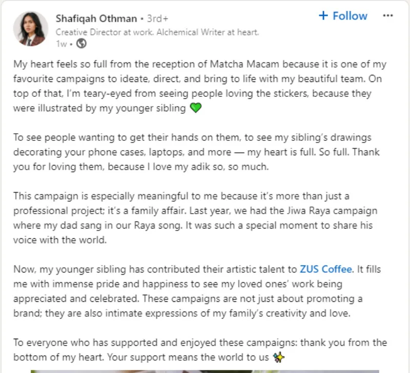 In case you’re wondering who was the artist behind these adorable cartoon cats on the merch, Shafiqah Othman, who is a writer, columnist and ZUS Coffee creative director, shared on her LinkedIn that her younger sibling was the illustrator. “My younger sibling has contributed their artistic talent to ZUS Coffee. It fills me with immense pride and happiness to see my loved ones’ work being appreciated and celebrated. These campaigns are not just about promoting a brand; they are also intimate expressions of my family’s creativity and love,” she wrote.