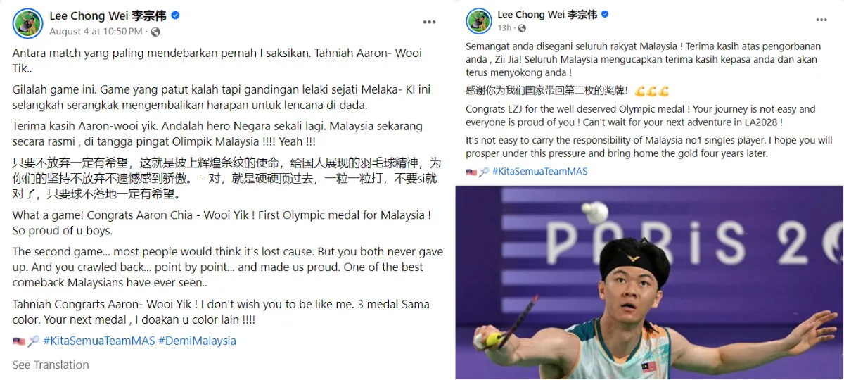 Lee Chong Wei first shared his congratulatory message for the men’s double pair, expressing pride over the win on Sunday (4th August 2024). In his post, the former world champion called the match “one of the most exhilarating he has witnessed” and “one of the best comeback Malaysians have ever seen”. Lee Chong Wei also expressed hope for the duo to continue to play well at the next games and jokingly wished Aaron and Soh Wooi Yik wouldn’t end up like him, with three medals of the same colour (silver).