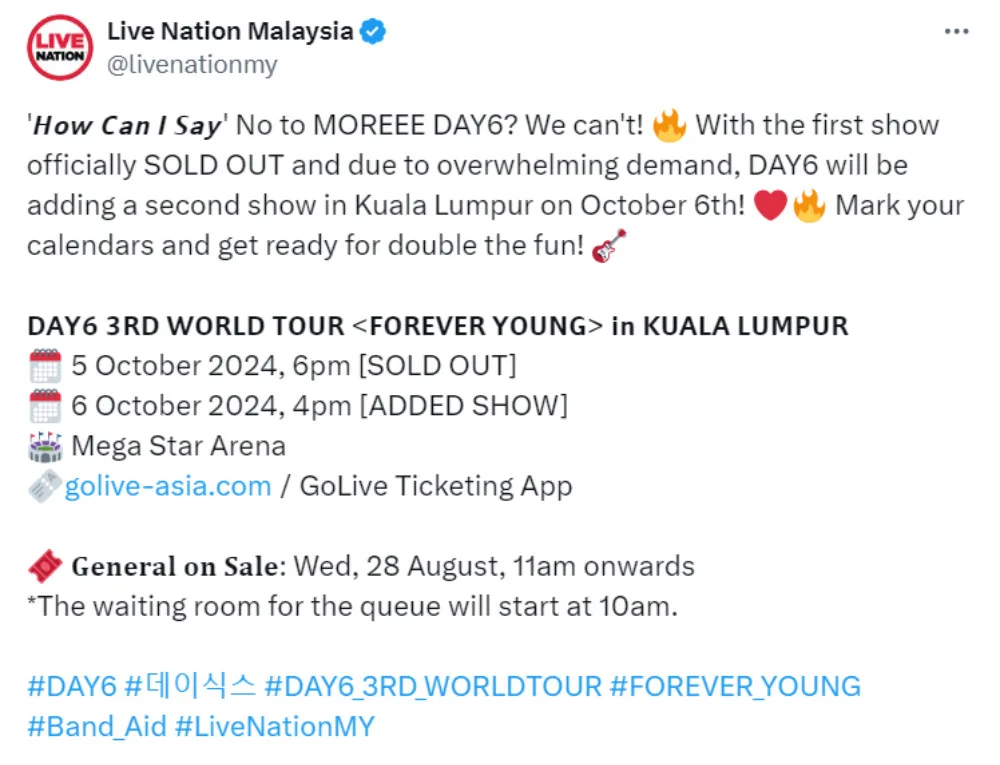 Live Nation announced the news via their social media accounts, revealing that DAY6 will perform another show on 6th October 2024 (Sunday) at Mega Star Arena, in addition to their first show on 5th October 2024 (Saturday). Ticket prices and seating remained unchanged, and tickets will go on sale on 28th August 2024 (Wednesday), from 11am onwards. This news comes after the official ticketing partner, GoLive Asia, hinted at a possible update to the concert.