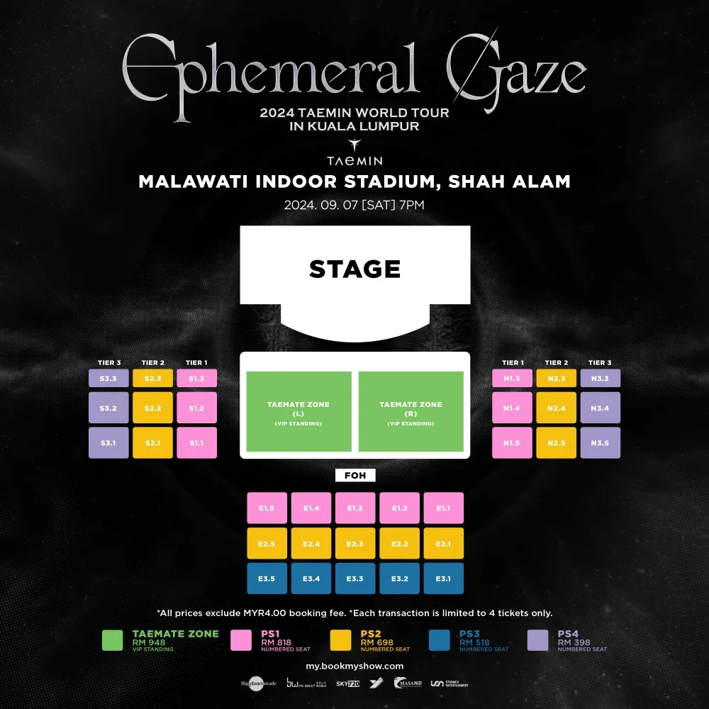 - Ticketing: TAEMATE Zone: RM948, PS1: RM818, PS2: RM698, PS3: RM518, PS4: RM398