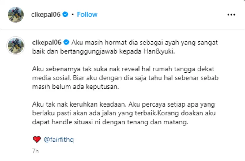 In a now-expired IG story, Jofliam claimed “that he’s no longer someone’s husband”. He also reiterated his statements that there was no infidelity nor did he ignore his responsibilities as a father and husband. “If people want to put all these labels on me then so be it. The truth will come out one day,” he said. Cik Epal has yet to share her side of the story but reassured her followers that they are currently working things out privately. Guess we’ll see how this story will end.