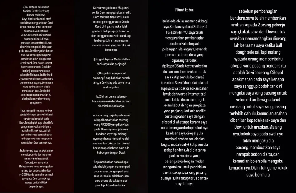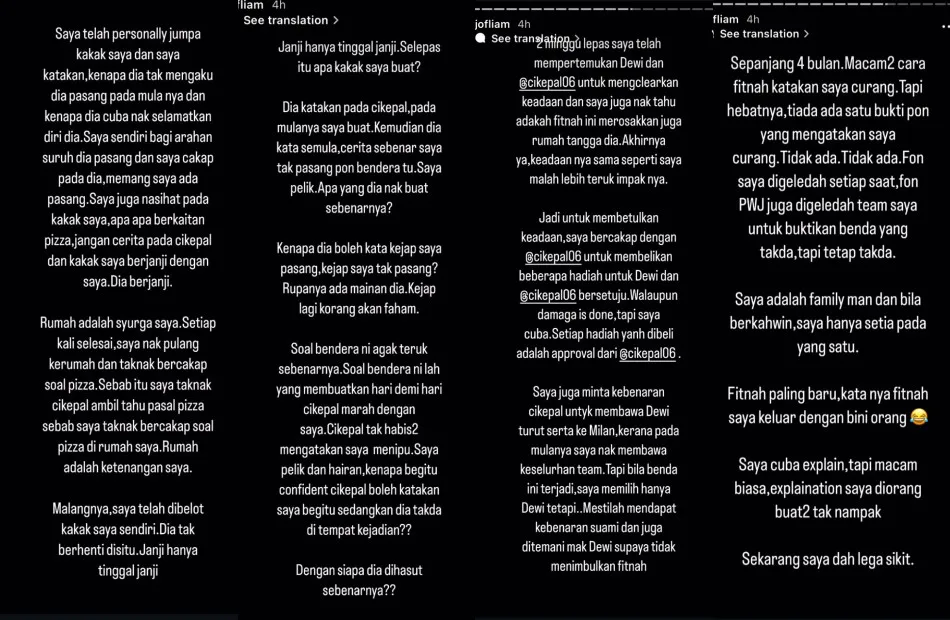Yesterday (Monday, 30th September), Jofliam posted a series of lengthy Instagram stories explaining the issues in his marriage. He claimed that a toxic staff member sought to sabotage his relationship by manipulating his wife, Cik Epal. The staff first allegedly fed him false information about an employee named Dewi, whom he believed he owed money. When his wife noticed the amount transferred, she questioned him about his actions but was not convinced by his answer.