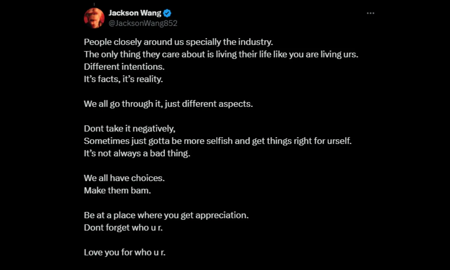GOT7 (갓세븐) member Jackson Wang (王嘉尔/잭슨) recently opened up about the harsh realities of the entertainment industry and how it affects stars. In a heartfelt tweet, the global superstar expressed his support for fellow team member BamBam (뱀뱀/แบมแบม), who has been candid about his struggles with his physical and mental health over the past few months.