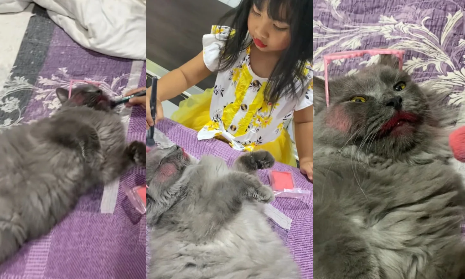 A video posted by user Dhia Mirza went viral recently on TikTok with 2.9 million views (at time of writing), showing a young girl applying makeup on her cat. The feline, named Tobby, can be seen lying calmly on the bed while enduring the child’s mischief.