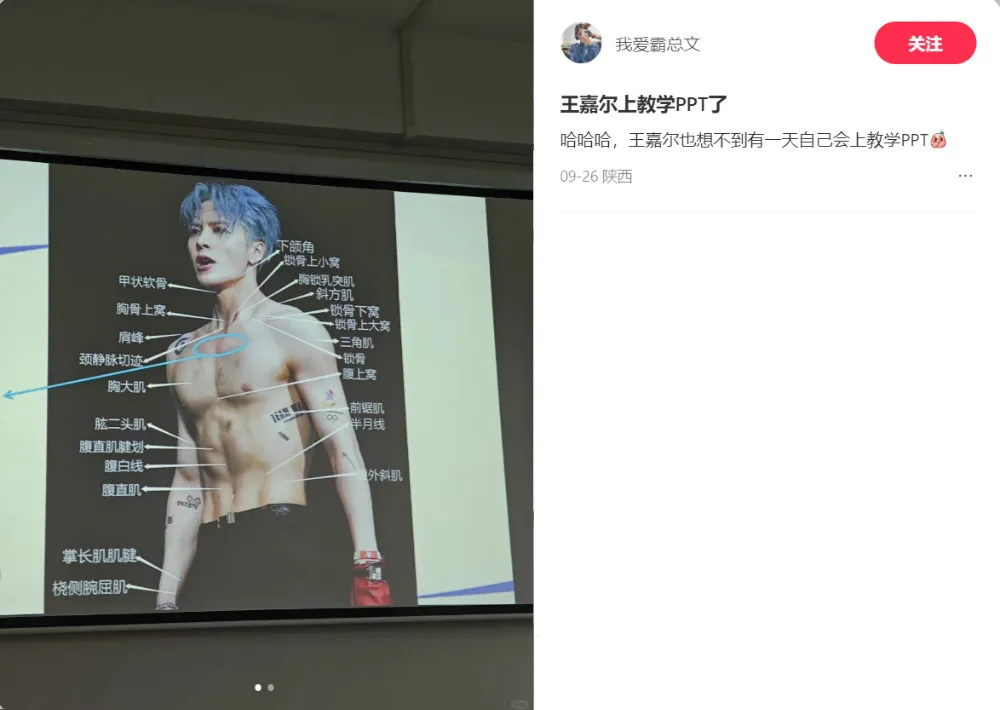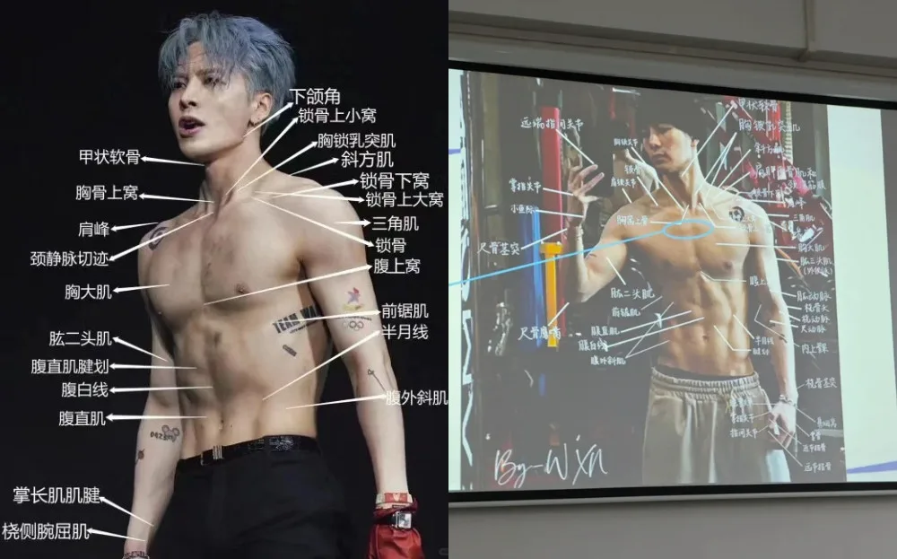 The student posted two photos on XiaoHongShu depicting two PowerPoint presentation slides displayed in a classroom. However, the slides were of two images of Jackson shirtless, with multiple labels pointing to various parts of his body. In the caption, the user wrote, “Jackson would have never thought that he would one day appear in a teaching PowerPoint.”