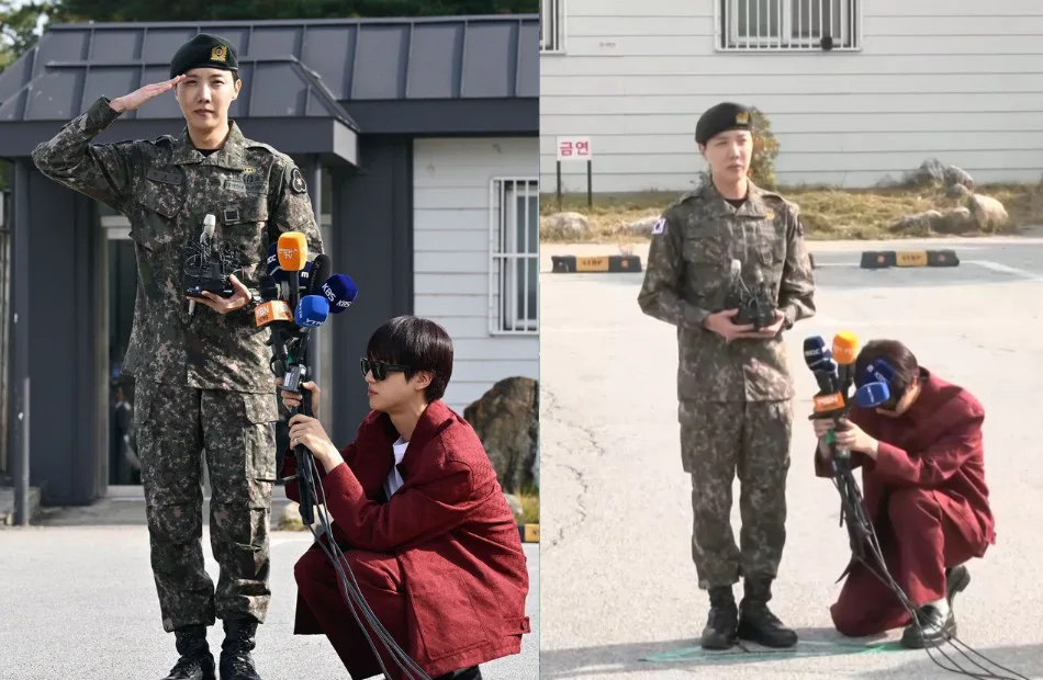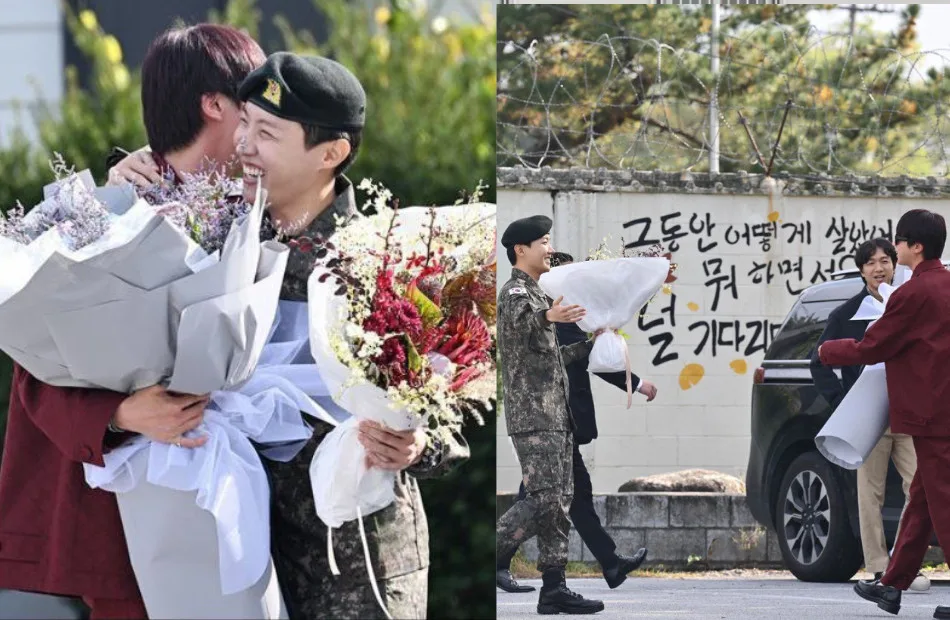 In a heartwarming moment, he was greeted by Jin and several staff members at the military base. They presented him with flowers, a traditional gesture to celebrate a soldier’s completion of service. As the popular idol gave his final salute at the guard station, he was seen smiling and hugging Jin, showing the close bond between the two members.
