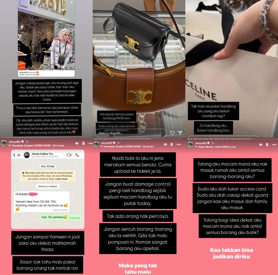Apart from the notice, the influencer also shared a number of IG Stories which alleged that Dewi had used a RM12K Celine handbag that actually belonged to her. “Don’t make me drag the Celine staff as my witness in court. You’re so shameless for using someone’s belongings without their permission,” she wrote. The content creator even insinuated that Dewi had persuaded Jofliam to deny her and her family access to his home to retrieve her belongings.