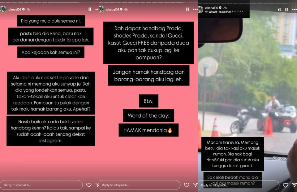 “I’ve been trying to settle this privately but she went ahead and air out our dirty laundry. She had the nerve to use my stuff? It’s a good thing that I have proof that the bag was mine,” Cik Epal stated. In her latest Instagram Story, the mother-of-two claimed that her ex-husband did not grant her permission to enter his premises, stating that he would drop their children off at the guardhouse for her to collect.