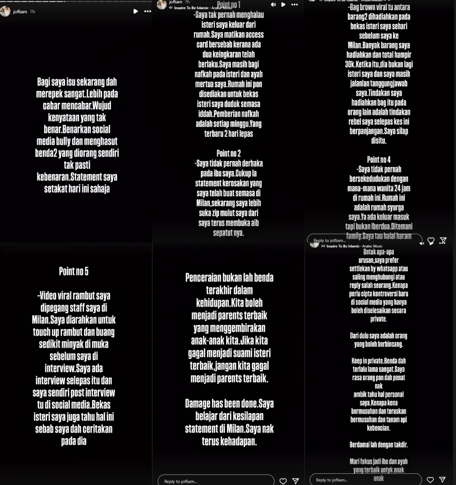 Meanwhile, Jofliam also took to IG Stories to deny allegations made by his ex-wife. He clarified that he did not kick her out nor deny her access to his house. As seen in the screenshots above, he explained rumours surrounding the handbags and what happened between him and his staff in Milan, Italy. “Divorce is not necessarily the end. Just because we failed to be husband and wife, doesn’t mean we should fail as parents. Damage has been done. I want to move on,” said the business owner.