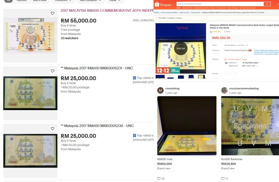 What these three largest banknotes have in common is that they are all commemorative notes, meaning that only a few thousand were issued, making them extremely rare. According to the Bank Negara Malaysia website, the RM600 note was originally valued at RM1,700 each, but today, some are reselling it for up to RM55,000 on eBay. The cheapest one we could find was on Shopee for RM6,500, but it was already sold to a buyer.