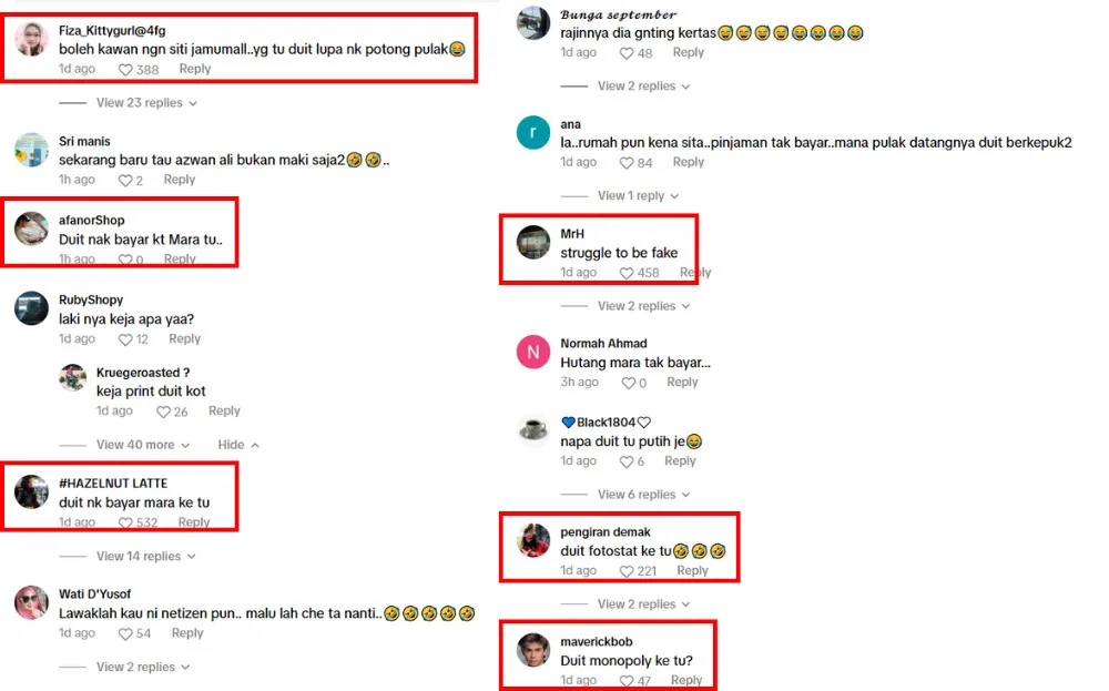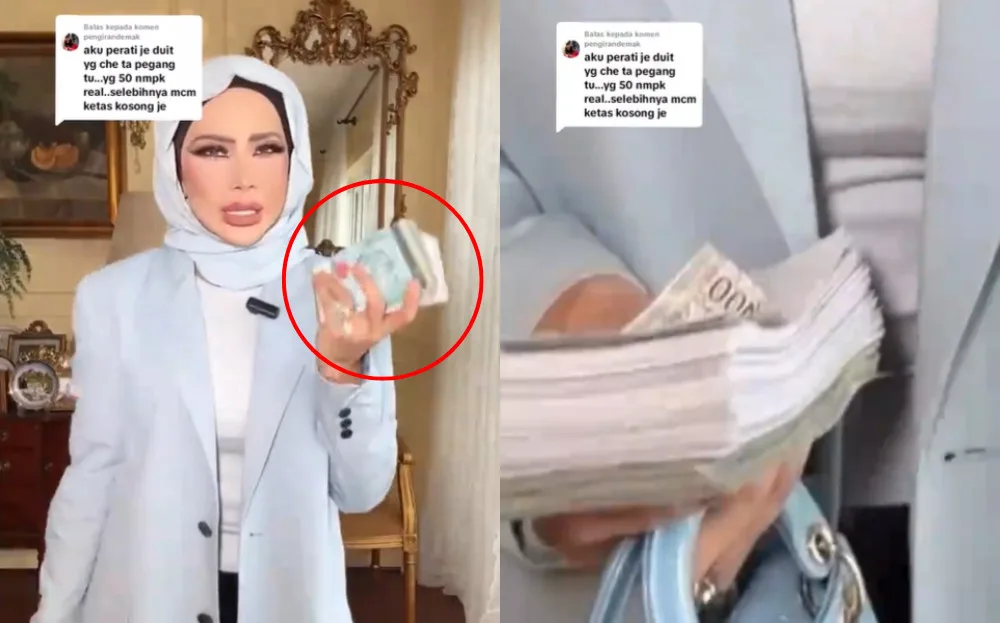 Rozita, known more familiarly as Che Ta, has kept mum about the issue, but has asked the public to refrain from speculating. Despite that, the news has sparked discussion about whether the star’s wealth was just a front. Recently, a TikTok user dissected an old video of the star in which she holds a stack of cash. In the video, the user zooms in on the stack to reveal that the centre is white, indicating that the centre portion isn’t actual cash.