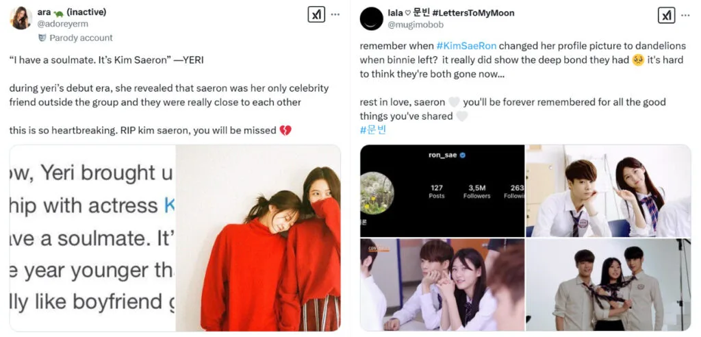 Many K-pop fans also shared tributes to the actress, who was well-acquainted with several idols, including Red Velvet’s (레드벨벳) Yeri (예리) and the late ASTRO’s (아스트로) Moonbin (문빈). Kim Saeron’s dandelion profile picture on her Instagram account is also a tribute to the late ASTRO member, who passed away in 2023. As such, many fans paid tribute to the late star, thanking her for always showing love and support for her idol friends.