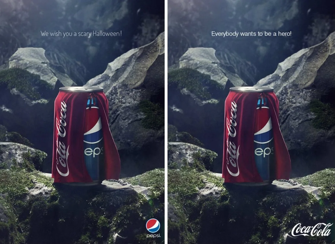 The infamous Coke vs Pepsi feud has been going on since the dawn of time and this advertisement is one of many to keep fans of the popular soda brands cackling over the feud. On the left, we have an ad from Pepsi’s Belgian ad agency where they dressed a can of Pepsi in a Coca-Cola-styled cloak with the words, “We wish you a scary Halloween”, signifying that it’ll be scary to go as Coke for the day. On the right is Coke’s answer to the ad, only changing their caption to, “Everybody wants to be a hero”, to add a cheeky twist on the Halloween campaign.