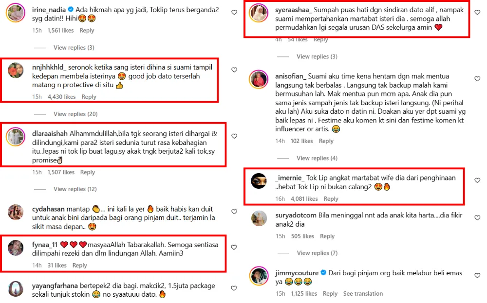 The feud has since subsided, but both sides received criticism from netizens. As such, many see Aliff spending money on jewellery for Shahida as his way of showing support for his wife. He also previously uploaded a video, sharing gratitude towards his wife for all her hard work caring for their family and business. The comments of both videos praised Aliff for how he treats his wife, with many saying it contributed to his success.