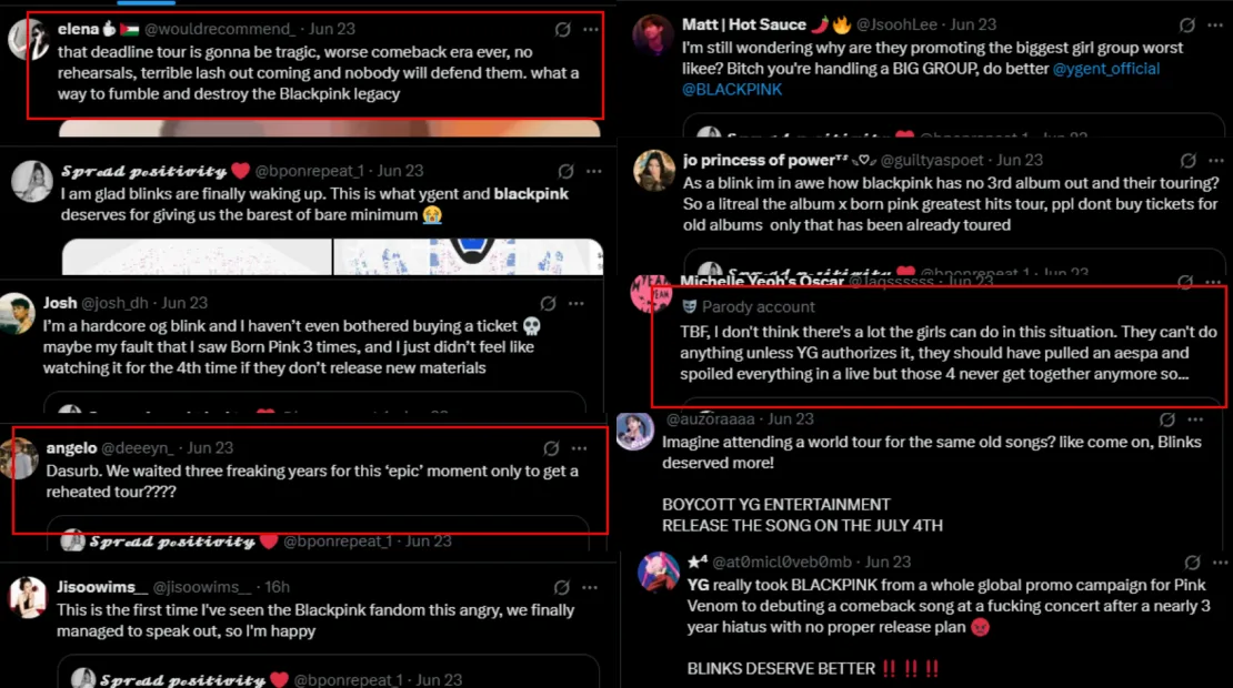Shortly after YG Entertainment announced that BLACKPINK would debut their new song at the Goyang concert, fans voiced frustration over what they saw as poor planning. Many criticised both the group and the agency, arguing that a tour without a new album is disappointing, as it means fans will have to wait even longer for fresh material.