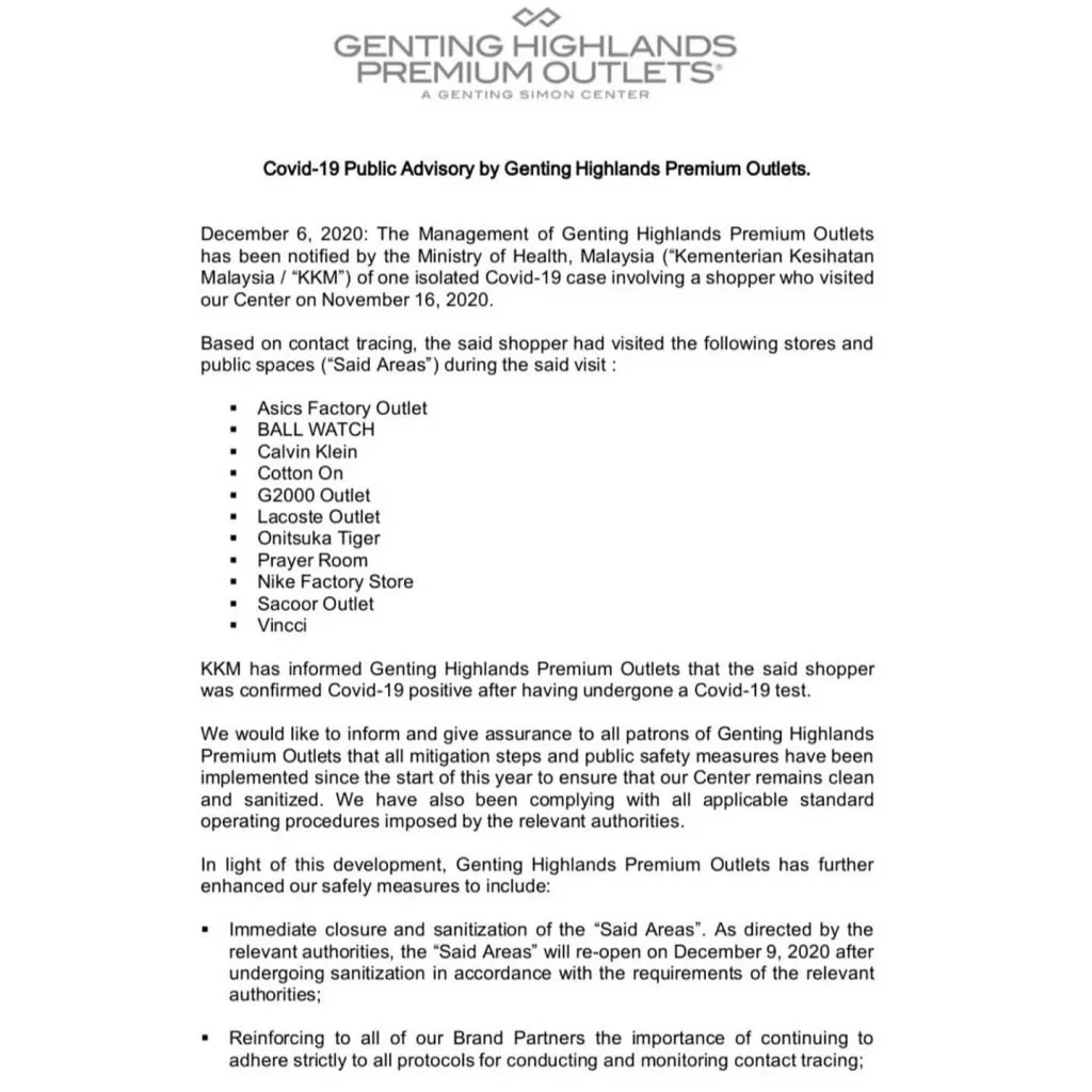 According to a Facebook post shared by Genting Highland Premium Outlets, these areas are said to have been visited by a Covid-19 patient on 16th November. Following the patient’s positive test results, contact tracing has then been carried out to identify and close down all areas visited by the patient on that day.